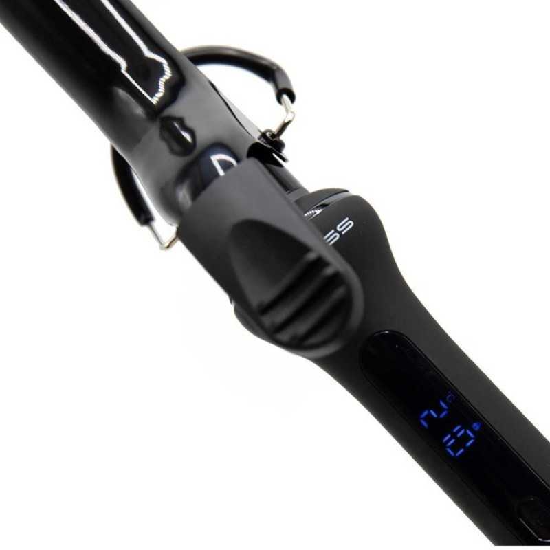 Tenacillas de 32 mm con barril largo de cerámica y turmalina, control digital de 80 °C a 210 °C, ideales para rizos rápidos, definidos y con acabado brillante.