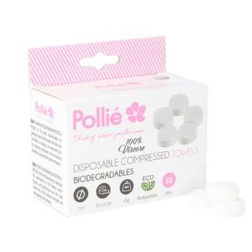 Toallitas comprimidas desechables Pollié. Se expanden al contacto con agua o loción, ideales para uso profesional en tratamientos estéticos y de peluquería.